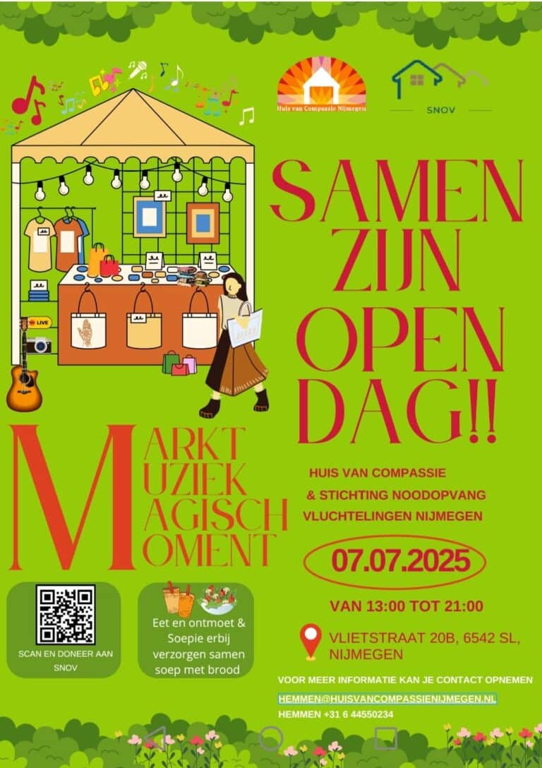 Save the date! Maandag 7 juli a.s. organiseert Huis van Compassie, samen met Stichting Noodopvang Vluchtelingen Nijmegen (SNOV) een Samenzijn/Open Dag. Je bent van 13.00-21.00 welkom aan de Vlietstraat 20b te Nijmegen. Vorig jaar was de eerste editie van de Samenzijn Markt. Een groot suc6! Veel bezoekers, mooi weer, talloze kraampjes en activiteiten. Dit jaar combineren wij de SZM met onze Open Dag. Maak op deze dag kennis met Huis van Compassie en wat wij allemaal te bieden hebben. Geniet ook van alle creativiteit, kennis en talenten van allerlei nationaliteiten. Wij zoeken in deze tijd de verbinding en de acceptatie.