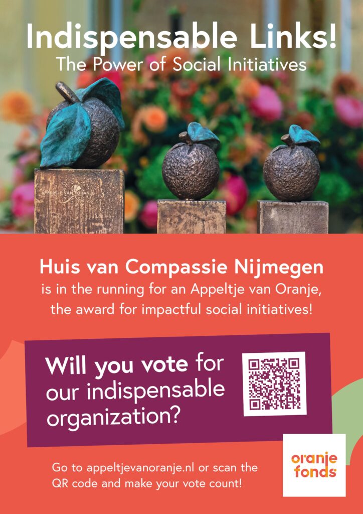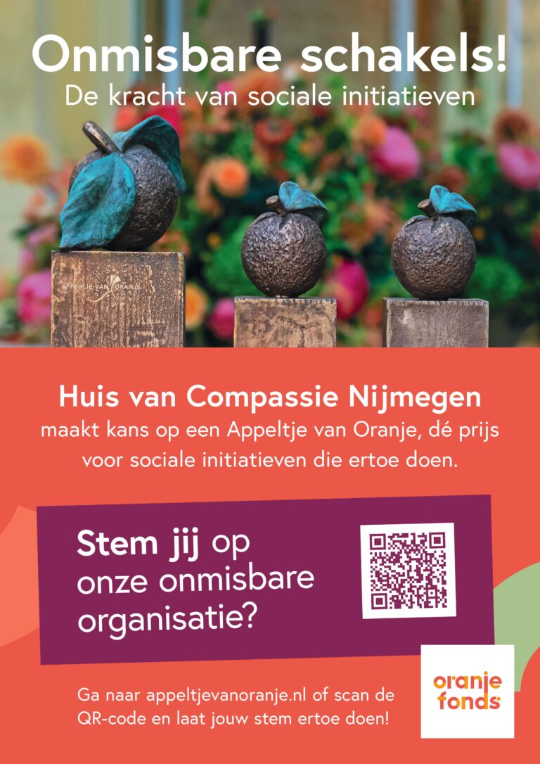 Stem op Huis van Compassie via deze link: https://www.appeltjevanoranje.nl/huisvancompassie en zegt het voort, zodat Huis van Compassie bij de laatste tien kanshebbers komt! Stem ook op Quiet wanneer je toch stemt, samen met hen zorgen wij voor verbinding en maken wij ons sterk voor onze doelgroepen: mensen die een steuntje in de rug kunnen gebruiken! https://www.appeltjevanoranje.nl/quiet